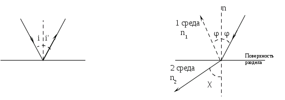 Луч падающий, нормаль к отражающей поверхности и луч отраженный лежат в одной плоскости (рис. 2), причем углы между лучами и нормалью равны между собой: угол падения i равен углу отражения i'. Этот закон также упоминается в сочинениях Евклида. Установление его связано с употреблением полированных металлических поверхностей (зеркал), известных уже в очень отдаленную эпоху.