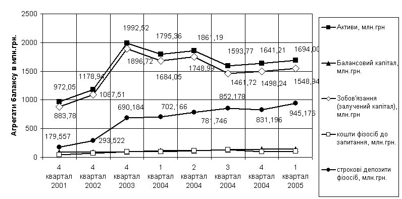 Аналіз фінансових характеристик діяльності досліджуємого в курсовій роботі АКБ «Правекс-Банк» на фоні загальних характеристик та тенденцій розвитку банківської системи України виявив наступні особливості його розвитку за 2001–2005 роки: