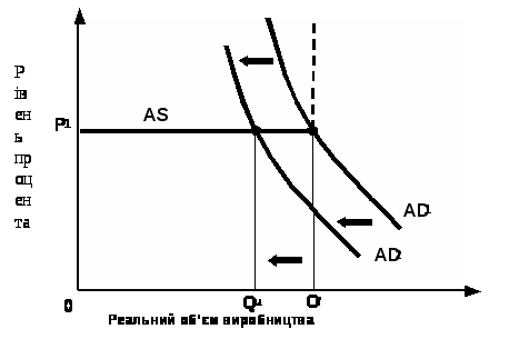 Нестабільний сукупний попит. Кейнсіанці вважають, що сукупний попит нестабільний, навіть якщо і не відбувається ніяких змін у пропозиції грошей. Зокрема, такий компонент сукупного попиту, як інвестиції, підданий коливанням, у зв'язку з чим змінюється положення кривої сукупного попиту. Припустимо, наприклад, що сукупний попит падає з AD>1> до AD>2>. Така зміна в сукупному попиті вплине лише на обсяг виробництва і зайнятість; відповідно реальний обсяг виробництва понизиться з Q>f> до Q>u>, а рівень цін залишиться постійним – P>1>. Більш того, кейнсіанці стерджують, що поки не відбудеться випадкового взаємноврівноважуючого розширення сукупного попиту, реальний обсяг виробництва буде постійно знаходитися в крапці Q>u>, що нижче рівня обсягу виробництва при повній зайнятості Q>f>.