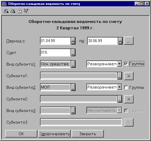 При запуске отчета на экран обычно выдается форма настройки параметров отчета или экранная форма диалога. В ней указывается период, за который формируется отчет, определяющих состав данных, включаемых в отчет. Например, при составлении отчета «оборотно-сальдовая ведомость по счету» выдается следующий диалог: