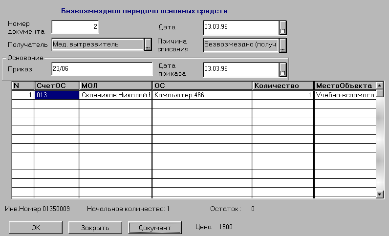 Документ «Безвозмездная передача» предназначен для оформления списания основных средств при их безвозмездной передаче Из документа можно распечатать «Акт приемки-передачи и на внутрен нее перемещение основных средств (форма № ОС-1)»