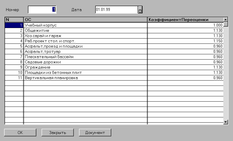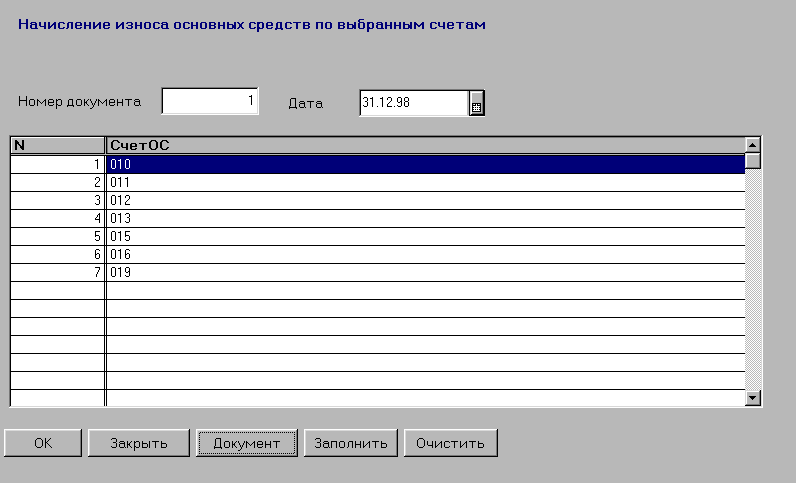 После заполнения последней графы таблицы на экран вновь будет выдан список основных средств для очередного выбора. Таким образом заполняются строки табличной части документа.