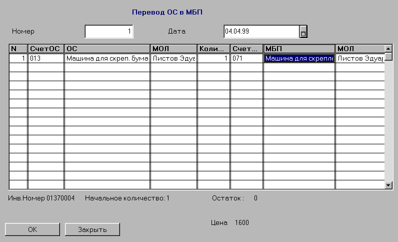 Документ «Перевод ОС в МБП»