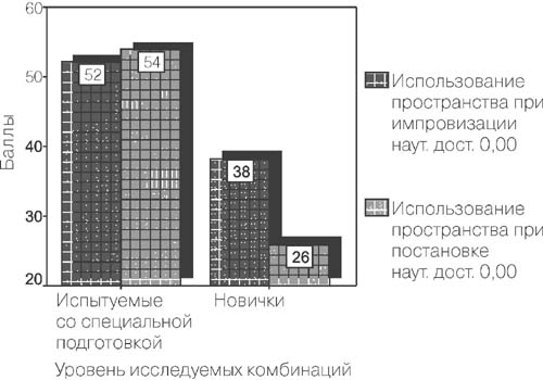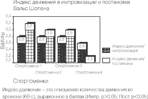 Результаты исследования. Существенным фактом успешного исполнения двигательной композиции является хороший настрой на музыку. В анкете испытуемые утверждали, что им нравится музыка и она побуждает их к движению. Все испытуемые выполняли движения под вальс Шопена на достаточно высоком уровне как при импровизации, так и при режиссерской постановке. Движения характеризовались четкостью, были свободны и разнообразны. Оценка двигательных комбинаций от импровизации к постановке повысилась на 0,5 балла, однако улучшение результатов было статистически недостоверным. При сравнении четырех испытуемых из 1-й и 2-й групп стали очевидными следующие детали. Темп движения у всех испытуемых был существенно лучше благодаря предварительному музыкальному прослушиванию и неплохо совпадал как при импровизации, так и при режиссерской постановке. Это было подтверждено главным образом в ходе анализа множества движений. Количество движений при постановке слегка увеличивалось, было заметным также небольшое увеличение их темпа. Однако достоверных статистических различий обнаружено не было (рис. 2).