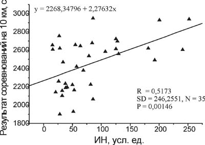 Рис. 2. Связь между ИН в подготовительном периоде годичного тренировочного цикла и результата ми соревнований на 10 км