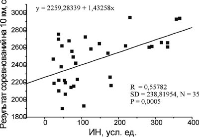 Таким образом, индивидуальные значения (ИН) спортсменов в переходном и подготовительном периодах связаны с результатами лыжных гонок на 10 и 5 км. Зная индивидуальную величину ИН и подставив ее в уравнение регрессии, можно с достаточной степенью достоверности рассчитать вероятный результат соревнований.