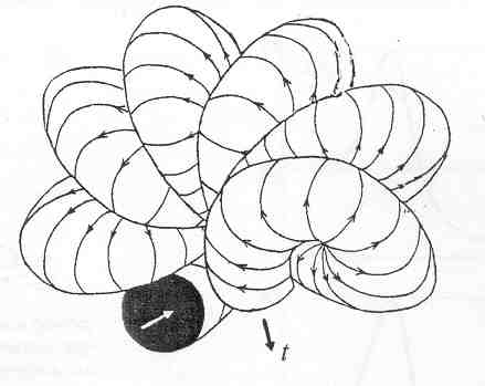 Роль ЭФ среды в процессах упорядочения в косных системах проявляется особенно отчетливо при температурах близких к 0 К. Известно [24], что специфика поведения кооперативной системы частиц в процессе ее упорядочивания или фазового перехода не зависит от характера взаимодействия между частицами, подчиняясь некому общему закону. Данная общность свидетельствует о том, что в основе самоупорядочивания вещественных систем лежит механизм как их взаимодействия с ЭФ среды (эфира), так и взаимодействия ЭФ среды между собой. Базовую или вакуумную метрику эфира образуют ЭФ электромагнитной и нейтринной природы [9]. Первые проявляют себя через реликтовое излучение, фотоны которого (R ~ 0.1 см) спонтанно образуются во Вселенной по механизму бутстрапа при конденсации фотоноподобных ЭФ эфира с радиусом кривизны порядка 1010 см [9]. Нейтринные ЭФ эфира, наряду с их важной биогенной функцией (см. выше и [10]) могут отвечать за механизм универсальных инерционно-гравитационных взаимодействий [9]. Кроме того, хиральная метрика нейтринных ЭФ [1] межзвездной среды может отвечать за механизм “закручивания” потока фотонов в спираль (Рис 4). Винтовые траектории фотонов в потоке прописывают макрометрику нейтринных ЭФ эфира (Рис 2). Сам поток фотонов, приобретая момент импульса, заставляет вращаться мелкие бусины [25].