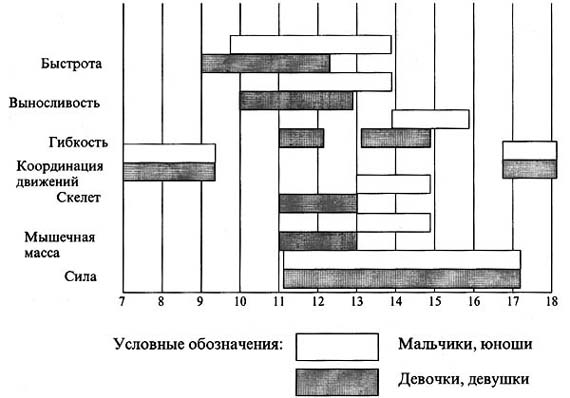 Рис. 3. Периоды ускоренного развития основных физических качеств, скелета и мышечной массы школьника