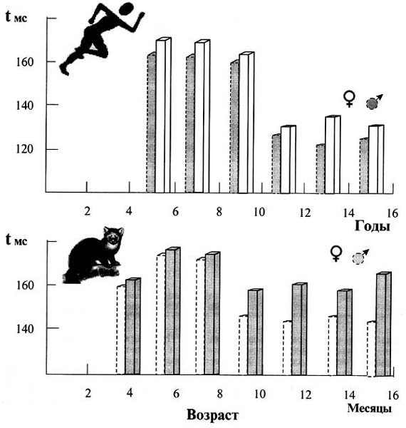 Для сопоставления развития биодинамических элементов у человека и животного во времени мы приняли во внимание продолжительность жизни и время наступления половой зрелости у этих двух объектов (рис. 2).
