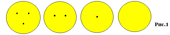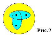 Поставим в соответствие множеству размерностей пространства множество точек. Тогда 3-мерное пространство соответствует множеству из трех точек, 2-мерное - множеству из двух точек, 1- мерное - множеству из одной точки, 0- мерное - пустому множеству точек. Рассмотрим пересечения подмножеств точек в множестве из трех точек (рис.2).