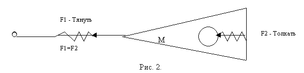 На первом этапе важнее всего убедиться в том, что при вращении тела с помощью веревки центростремительная сила действует с внешней стороны тела! В учебниках по физике часто приводятся рисунки опытов, в которых пружина, измеряющая силу "притяжения", помещается в разрыв веревки, на которой вращается тело. На основании растяжения пружины утверждается, что тело надо "притягивать" к центру, и поэтому сила - центростремительная. Однако если тело установить так, как показано на рис. 2, через другую пружину, то станет понятно, что на самом деле веревка толкает тело к центру. Оставаясь радиальной, сила действует на тело с его внешней стороны! Это человеку, вращающему тело надо тянуть веревку к себе, а веревка толкает тело в центр вращения с его внешней стороны, о чем красноречиво говорит не растягивающаяся, а сжимаемая веревкой пружина! Сила, созданная человеком внутри системы, за счет конструкции, передающей его усилие, для тела оказалась реально приложенной извне и является – к центру толкательной!