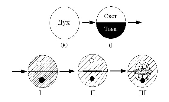 Этап-0. Спонтанная флуктуация Духа на две непрерывные формы духа Свет и Тьма: Словом Его ста вода яко стог [Сир 39, 23]; тма верху бездны, и Дух Божий ношашеся верху воды [Быт 1, 2]; тогда глаголал Еси, да от сокровищ Твоих произнесется свет светлый, имже бы явилося дело Твое [3 Езд 6, 39, 40].
