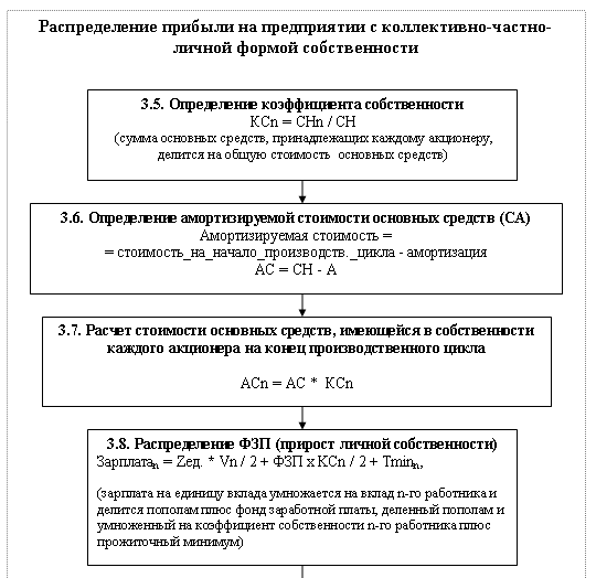 Работа предприятия на основе коллективно-частно-личной собственности обеспечивается применением формулы образования цены, предложенной экономистом (академическим советником) Ю.Г.Фейгиным. Ее блок-схема приведена. на рис. 1. Данная схема образования цены одновременно позволяет определить и фонд заработной платы (ФЗП), и фонд развития производства (ФРП). И то и другое определяется как на этапе планирования, так и на этапе распределения фактической выручки.