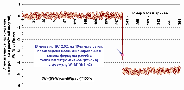 Более детальное изучение этого явления показало, что в этот момент времени таинственным образом выполнено переключение опломбированного тепловычислителя на “неполное” уравнение измерений Wот=0,001·[M1·(H2-H3)], что и привело к потере (обнулению) “учётной” составляющей Wгвс=0,001·[(M1-M2)·(H3-hхв)] и, как следствие, к систематическому занижению теплопотребления на уровне -4,7%. Однако и в данном случае сервисная организация активно отрицала факт тайного переключения уравнений измерений тепловой энергии, и, коль скоро “наладчик” не был пойман с поличным в присутствии свидетелей, то и доказать преднамеренность тайного искажения результатов учёта весьма непросто. А вдруг в самом деле разработчик такого “современного” теплосчётчика и сервисная организация тут ни при чём, а вся эта “экономия” то и дело происходит исключительно из-за случайных программных сбоев, которые почему-то никогда не случаются ранним утром или поздним вечером, по выходным или праздничным дням?