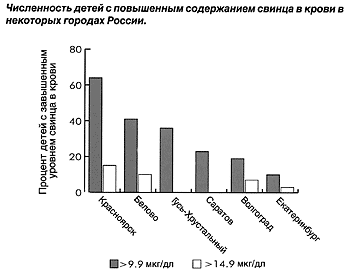 Среднее прогнозное содержание свинца в крови детей для городов с невысоким содержанием свинца в окружающей среде близко к контрольному нормативу - 10 мкг/дл. В городах с высоким содержанием свинца в окружающей среде этот норматив может быть превышен почти вдвое.