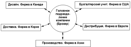 Рассмотрим структуру организации, которая является подрядчиком для аутсорсинговых компаний. Новый подход к организации предприятия с разделением полномочий между его подразделениями получил название “динамической сетевой организации” или организации с модульной структурой. Сетевая структура означает распределение основных функций между отдельными подразделениями и организациями. Координация действий осуществляется небольшим центральным офисом или “брокером”4. Главное отличие такой структуры в том, что основные операции, такие как производство, разработка новой продукции, сервис, бухгалтерский учет не собраны под одной крышей, а выполняются отдельными организациями (подразделениями) по контракту или по какой-либо другой договоренности. Связь центрального офиса с данными организациями (подразделениями) осуществляется (как правило) с использованием электронных средств и глобальной сети передачи данных. Революционность этого подхода к созданию бизнес-организации состоит хотя бы в том, что полагаясь на привычные определения и понятия трудно представить, что из себя представляет и где именно находится подобная организация. В качестве примера можно привести фирму, занимающуюся разработкой программного обеспечения. Разработка различных частей крупного программного продукта (ядро, оболочка), как правило, идет с привлечением команд по всему миру. Крупные промышленные фирмы, специализирующиеся на выпуске электронной аппаратуры и компьютеров, такие как Compaq и IBM, прежде полностью выполнявшие самостоятельно весь цикл разработки и производства техники, теперь заказывают по своим чертежам и технологическим картам производство аппаратуры азиатским компаниям. Так им удается понизить себестоимость своей продукции и легче выдерживать конкуренцию с производителями более дешевых аналогов.