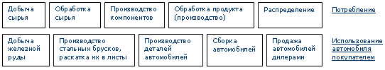 Третья координата масштаба не менее важна. Компании должны очень взвешенно принимать решение о звеньях вертикальной цепи (от сырья до потребляемой продукции), в которых они будут непосредственно участвовать. Конечно, далеко не в каждой цепи имеется одно и то же количество звеньев, и не все звенья могут иметь важные промежуточные структуры. Как правило, вертикальная цепь включает добычу и обработку сырья, производство компонентов, сборку продукта (производство), распределение и потребление (рис. 1).