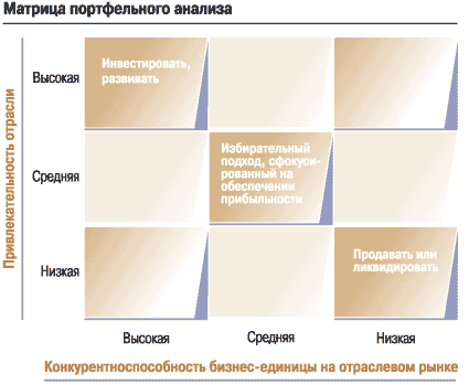 Подход к формированию корпоративной стратегии, применявшийся McKinsey в 1970–е гг., можно схематически представить в виде матрицы портфельного анализа, в которой по одной оси определяется уровень привлекательности конкретной отрасли для корпорации, а по другой — конкурентоспособность бизнес–единиц этой корпорации на отраслевом рынке. Такая матрица позволяла отобразить потенциал повышения стоимости компании буквально на одной странице.