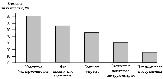 Как видно из рисунка, для многих российских предприятий закрытость компаний-партнеров и собственный комплекс "засекреченности" (а по неофициальному "Кодексу бенчмаркинга" можно запрашивать у компании партнера только ту информацию, которую вы сами готовы предоставить) является важнейшей преградой для инициирования бенчмаркингового исследования. В России сложилось так, что не каждый готов дать информацию о своем предприятии. Кроме того, существующие системы налогообложения и финансового учета компании, не всегда позволяют получить реальные данные по тем или иным показателям.