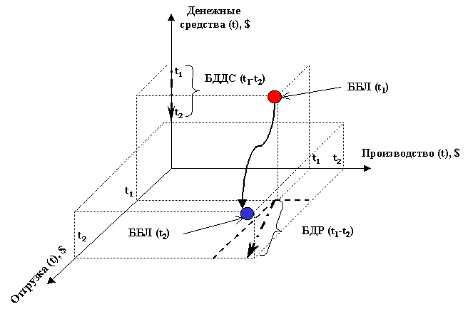 На основе БДР и БДДС можно составить бюджет по балансовому листу (ББЛ), в рамках которого можно определить динамику коэффициентов ликвидности, обеспеченности собственными оборотными средствами и т.д. Бюджет по балансовому листу является “функцией состояния”, в то время как БДР и БДДС – “функциями процесса”. Поэтому, вообще говоря, не вполне корректна модель, при которой БДР, БДДС и ББЛ представляются независимыми координатами, в которых состояние предприятия описывает некую траекторию [4]. Скорее, графическое отображение модели должно представлять из себя: