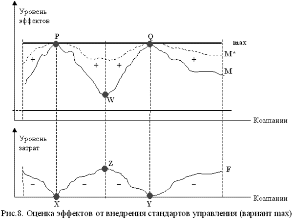 Рис.8 демонстрирует случай установления стандарта на максимальном уровне, то есть на уровне параметров систем управления лучших компаний, находящихся в точках P и Q. Соответственно, для них отсутствуют затраты (ими уже совершены данные затраты) по разработке и внедрению стандартов управления - нижний график точки X и Y. Для предприятий с наихудшими параметрами систем управления (т. W), напротив, при прочих равных условиях, требуются наибольшие расходы по внедрению установленных стандартов, что в первую очередь связано с необходимостью серьезной перестройки модели функционирования компании, внедрения информационной системы, обучения персонала. Таким образом, общий эффект от использования стандарта достигается путем оценки эффектов от стандартов (площадь между кривыми M и M*), а также суммарными затратами на внедрение стандартов управления (площадь между кривой F и осью абсцисс нижнего графика).
