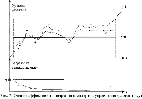 Из рисунка видно, что при установлении максимального для данной эволюционной стадии развития уровня стандарта (вариант а) в целом происходит существенное смещение траектории развития системы управления вверх, при этом достигается положительный эффект. По сути, количественно площадь между двумя кривыми и отражает тот эффект, который получает система управления от внедрения стандарта. В случае с вариантом b, стандарт устанавливается на некотором уровне внутри коридора эволюционного развития системы управления, при этом как видно существуют зоны, где система получает как положительные, так и отрицательные эффекты. В варианте c, действие заниженного стандарта всегда отрицательно сказывается на функционировании системы управления.