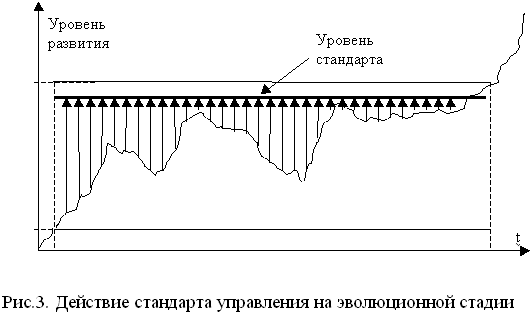 Логично утверждать, что на эволюционных стадиях развития организации разработка и использование стандартов управления очевидна. Бесспорность уместности стандартов на эволюционной стадии развития организации обеспечивается самой природой эволюционного развития компании и, соответствующего функционирования системы управления. На эволюционной стадии развития предприятия происходит относительная стабилизация функционирования компании, что, как правило, выражается в отсутствии существенных колебаний параметров деятельности подсистем организации. Таким образом, стандарты функционирования подсистем организации (в т.ч. управленческой подсистемы) на эволюционной фазе фиксируют складывающуюся на данном этапе развития практику.