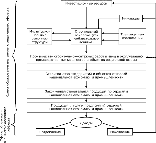 Рисунок 2. Схема образования внутреннего (эндогенного) и внешнего (экзогенного) эффектов в системе инвестиционно-строительной деятельности