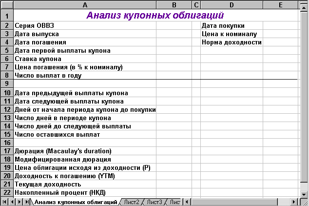Очистите таблицу от исходных данных (блоки ячеек В2.В8 и Е2.Е4) и сохраните на магнитном диске в виде шаблона BONDCOUP.XLT.