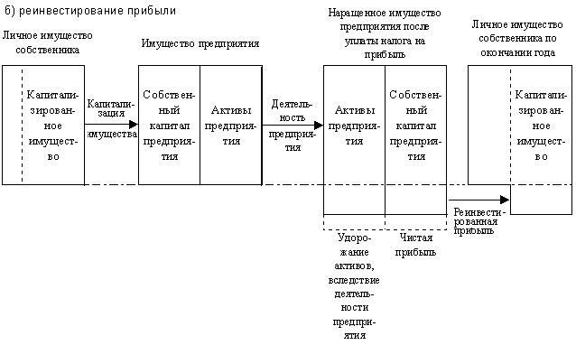 Как видно из схемы, богатство собственника увеличивается в любом случае. Однако при получении дивидендов он увеличивает ту часть своего личного имущества, которая находится в его непосредственном распоряжении и может быть использована для личного потребления. В другом случае увеличивается отчужденная часть его имущества, вложенная в собственный капитал предприятия. Однако подобное отчуждение не означает полную утрату собственности на это имущество. При необходимости владелец может продать свою долю в собственном капитале предприятия (например, акции) и получить взамен деньги, которые может использовать по своему усмотрению