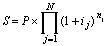 То есть средняя процентная ставка составила 33,75% и начисление процентов по этой ставке за весь срок ссуды дает такой же результат, как и тот, что был получен по формуле (1). Для сложных процентов выражение примет вид: