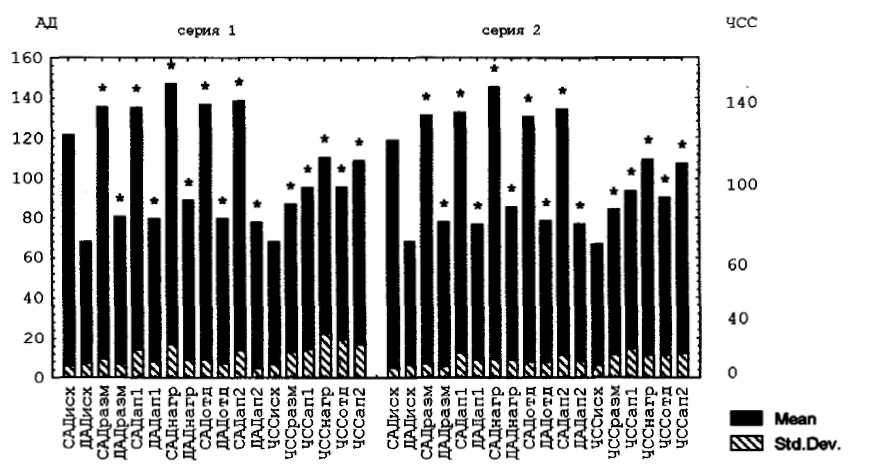 Рис. 1. Изменение АД и ЧОС под влиянием 60 выпадов в течение 2 минут (серия 1), бега на месте 15 секунд и