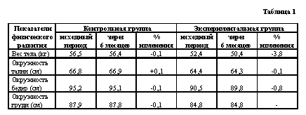 Первая группа (11 человек) - экспериментальная, занималась ритмической гимнастикой с элементами шейпинга и аэробики два раза в неделю по 60 мин. Вторая группа (11 человек) - контрольная, занималась физической культурой два раза в неделю согласно программе по физическому воспитанию в вузе. Физическое развитие у занимающихся оценивали по следующим показателям: вес тела (кг); окружность бедер (см); окружность талии (см); окружность груди (см).