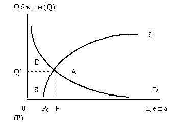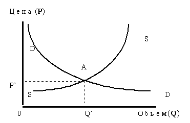 Кривые спроса и предложения в интерпретации А.Маршалла показаны на рисунке 1. На нем кривая предложения по традиции обозначена двумя буквами S, а кривая спроса - двумя буквами D. Точка пересечения этих кривых, обозначенная буквой A, характеризует точку рыночного равновесия с равновесной ценой P' и равновесным объемом продаж Q'.