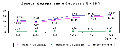 Несколько иная динамика доходов федерального бюджета. Если удельный вес доходов федерального бюджета в объеме ВВП в 1995 году составлял 15,1 %, в 1996 году - 14,9 %, а в 1998 году даже снизился до 11,9 %, то в 2000 году он составил 16,0 %, а в январе - июне 2001 года - 17,6 % при 15,4 %, представленных в расчетах к проекту федерального закона "О федеральном бюджете на 2001 год", в январе - сентябре 2001 года - 16,9 процента.
