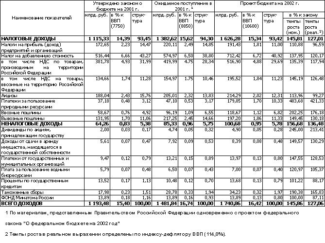 Темпы роста объема ВВП и индекс потребительских цен в январе -сентябре 2001 года позволяют сделать вывод о том, что объем ВВП в сумме 7750 млрд. рублей и уровень инфляции 12,0 % (декабрь 2001 года к декабрю 2000 года), предусмотренные статьей 1 Федерального закона "О федеральном бюджете на 2001 год", будут существенно превышены. По оценке Правительства Российской Федерации, объем ВВП в 2001 году составит 9090 млрд. рублей, уровень инфляции - 18,0 %. В заключении Счетной палаты на проект федерального закона "О федеральном бюджете на 2001 год" указывалось на недостаточную обоснованность прогнозируемых объема валового внутреннего продукта, уровня инфляции и цены на экспортируемую нефть. Фактическая динамика этих показателей подтвердила выводы Счетной палаты.