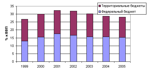 Доходы федерального бюджета и территориальных бюджетов 1999-2005 гг. (в % к ВВП)