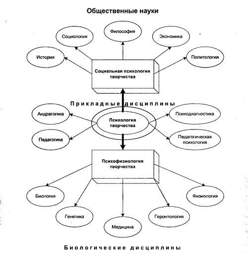 Рассматривая процесс рождения и становления новых направлений в психологии творчества, А.В.Морозов, Д.В.Чернилевский отмечают, что ряд научных направлений выделились в социальную психологию и психофизиологию творчества (см. рис. 1). Вокруг психологии творчества и группы смежных с ней психологических наук сложилось множество прикладных дисциплин, связы вающих психологию с педагогическими... и другими по добными им науками, а через них с практикой» (А.В.Морозов, Д.В.Чернилевский, 2004, С.39).