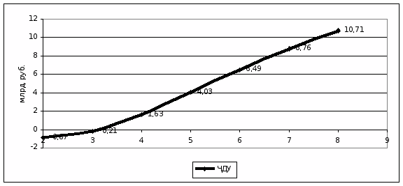 Точка безубыточности при условии выполнения плановых показателей, соответствующая сроку окупаемости, соответствует приблизительно 1 году и 2 месяцам (точка пересечения линий 1 и 2, рис.2). Далее знак ЧДУ меняется на положительный и его величина