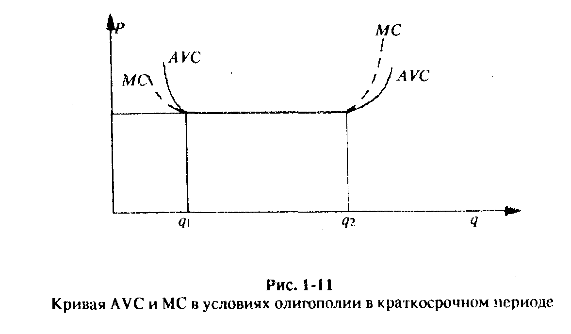 Способность удерживать цены в краткосрочном периоде заложена в самой структуре фирм-олигополистов: планируя производство, они заранее подготавливают его к возможным падениям или увеличениям спроса. Обычно фирма-олигополист имеет своеобразную кривую средних переменных издержек (рис. 1-11). При такой кривой A VC выпуск товара с величины q1 до q2 может производиться при одном и том же уровне переменных издержек. На этом интервале предельные издержки также не меняются и равны средним переменным.