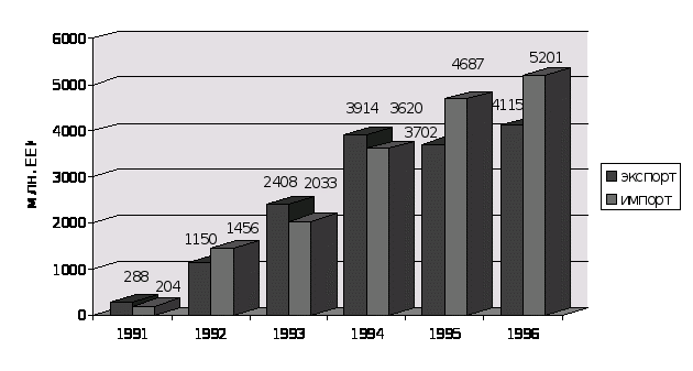 В 1993 году экспорт составил 2408,5 млн. ЕЕК, импорт 2033,3 млн. ЕЕК, сальдо было положительным и равнялось 375,2 млн. ЕЕК (6) (График 3)..