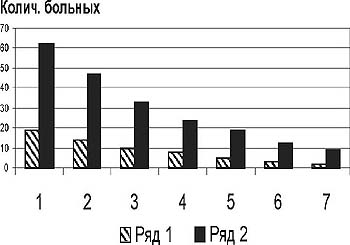 Рис. 1. Клиническая картина (структура) психопатологических синдромов у единоборцев, больных атопическим дерматитом (n=61), где: ряд 1 - абс. количество наблюдаемых, ряд 2 - количество наблюдаемых в %, а по горизонтали: 1 - депрессивный синдром, 2 - тревожно-фобический синдром, 3 - неврастенический синдром на фоне зуда и диссомнии, 4 - астенический синдром, 5 - ипохондрический синдром, 6 - эксплозивно-дисфори ческий синдром, 7 - сверхценная ипохондрия