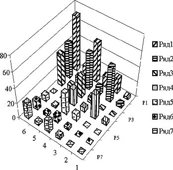 Рис. 2. Частота психопатологических синдромов при различных формах атопического дерматита у обследованных единоборцев (n=61), где: ряд 1- депрессивный синдром, ряд 2 - тревожно-фобический синдром, ряд 3 - неврастенический синдром, ряд 4 - астенический синдром, ряд 5 - ипохондрический синдром, ряд 6 - эксплозивно -дисфорический синдром,ряд 7 - синдром сверхценных образований.