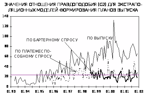 В описанном выше варианте экстраполяционная модель предполагает, что прогнозы формируются под влиянием предыдущих изменений того же показателя. Для исследования переходных экономик можно использовать и такие экстраполяционные модели, в которых прогнозы одного показателя, формируются под влиянием предшествующих изменений другого. Например, выглядит логичным рассмотреть влияние на прогнозы изменения выпуска предыдущих изменений платежеспособного или бартерного спроса. Такие модели формирования производственных планов можно считать более прогрессивными по сравнению с экстраполяцией выпуска. При этом ориентацию на платежеспособный спрос следует расценивать как более рыночную позицию производителей, чем ориентацию на бартерные сделки. Для проверки, какой спрос является для производителей предпочтительным, можно исследовать комбинированную экстраполяционную модель, в которой в качестве независимых переменных одновременно используются изменения и платежеспособного, и бартерного спроса.