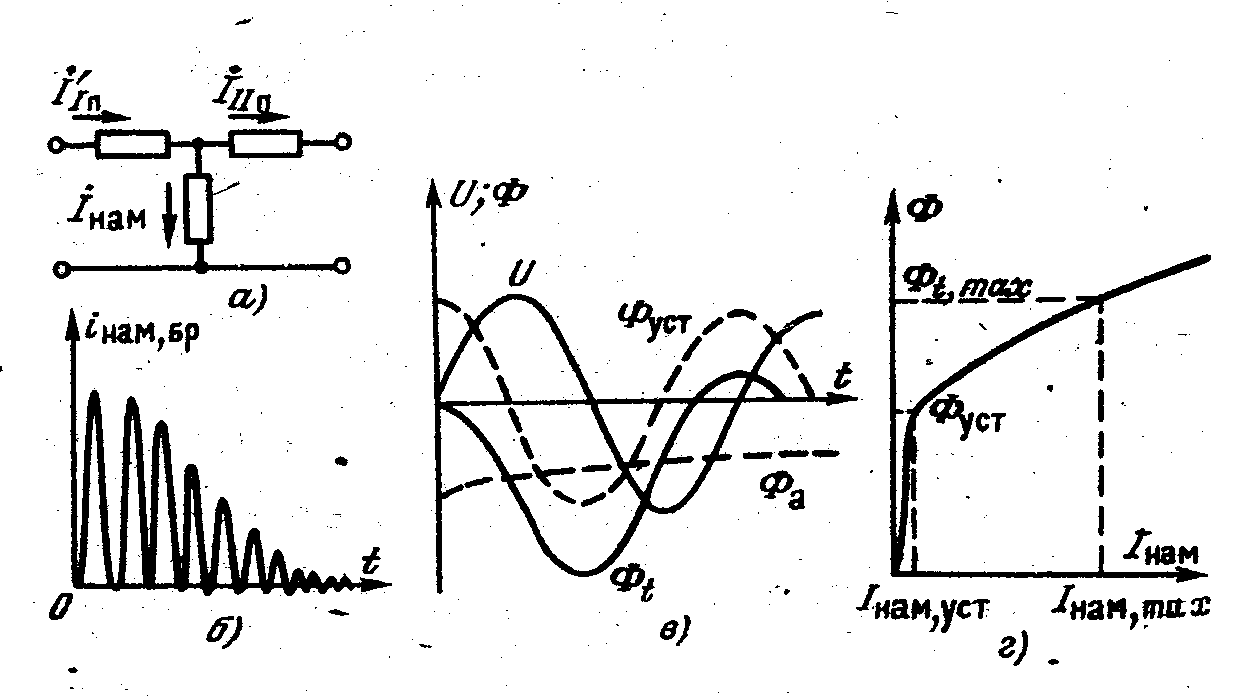 Бросок тока намагничивания при включении трансформатора под напряжение или при восстановлении напряжения после отключения внешнего к. з. Ток намагничивания трансформатора (рис. 4, а) I>нам> = I>1>>п>— I>11>>п> в нормальном режиме работы невелик и составляет 2—3% номинального тока I>т,ном>>.> После отключения внешнего к. з., как и при включении трансформатора под напряжение, возникающий бросок тока намагничивания может превышать номинальный ток /т,ном в 6—8 раз.