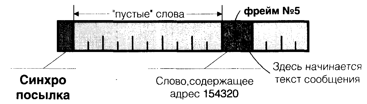 Пусть нам необходимо передать сообщение на физический адрес 1234565. Делим 1234565 на 8 Получается: 1234565/8=154320 и остаток 5. Это значит, что результат деления будет передан в пятом фрейме. Формируем блок, содержащий адрес пейджера: