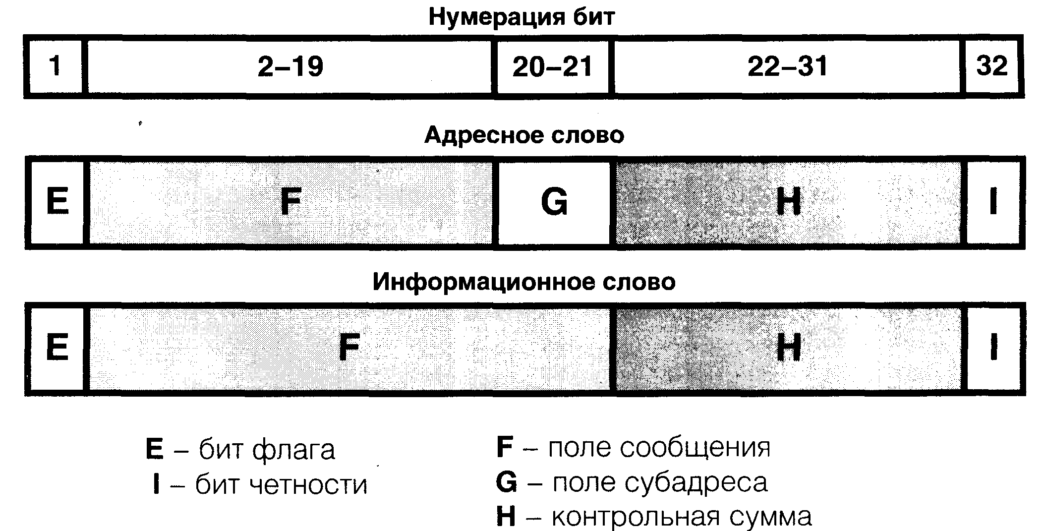Бит флага (Е) используется для различения адресного и информационного кодовых слов: 0 -адресное слово, 1 - информационное слово.