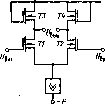 В рассматриваемом ДУ МДП-транзисторы Т1 и Т2 выполняют свои основные усилительные функции активных элементов, а ТЗ и Т4 — функции резисторов. Такой ДУ иногда называют усилителем с динамической нагрузкой.