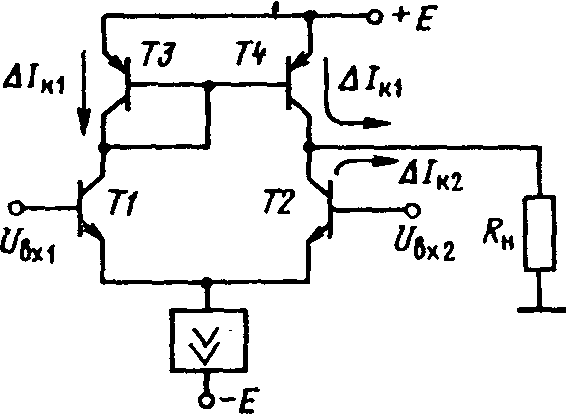 На рис. 16 приведена принципиальная схема одного из вариантов ДУ с динамической нагрузкой. Этот ДУ выполнен на комплементарных транзисторах: п-р-п транзисторах Т1, Т2 и р-п-р транзисторах ТЗ и Т4. Транзисторы Т1 и Т2 выполняют свои обычные функции усилительных элементов, а транзисторы ТЗ и Т4 — нагрузочных элементов, т. е. резисторов. Транзистор ТЗ включен по схеме диода. Предположим, что на базу у транзистора Т1 приложена в рассматриваемый момент положительная полуволна U>вх1>. В результате в цепи транзистора ТЗ возникает приращение тока ∆I>к1> протекающего в направлении, указанном стрелкой на рис. 16. За счет этого тока возникает приращение напряжения между базой и эмиттером ТЗ, которое является приращением входного напряжения для транзистора Т4. Таким образом в цепи эмиттер—коллектор Т4 возникает приращение тока, практически равное ∆I>к1>, поскольку в ДУ плечи симметричны. Структуру, основой которой являются транзисторы ТЗ и Т4, принято называть отражателем тока, или токовым зеркалом. Отражатели тока находят широкое применение в современных ИС непрерывного действия.