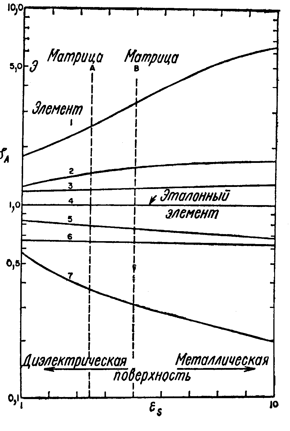 Фиг.12. Зависимость коэффициентов >А> относительной чувствительности к разным элементам от типа поверхности образца[1].